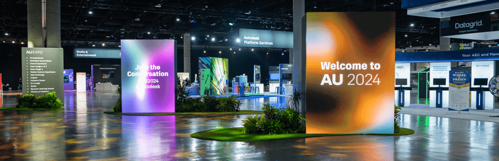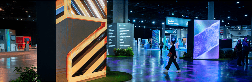 Autodesk capabilities: Visually engaging LED installations with interactive touchscreens animated exhibits on the expo floor.