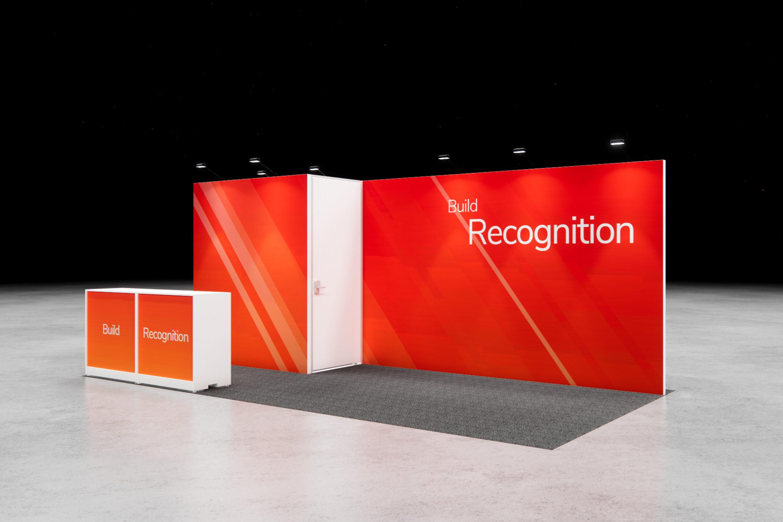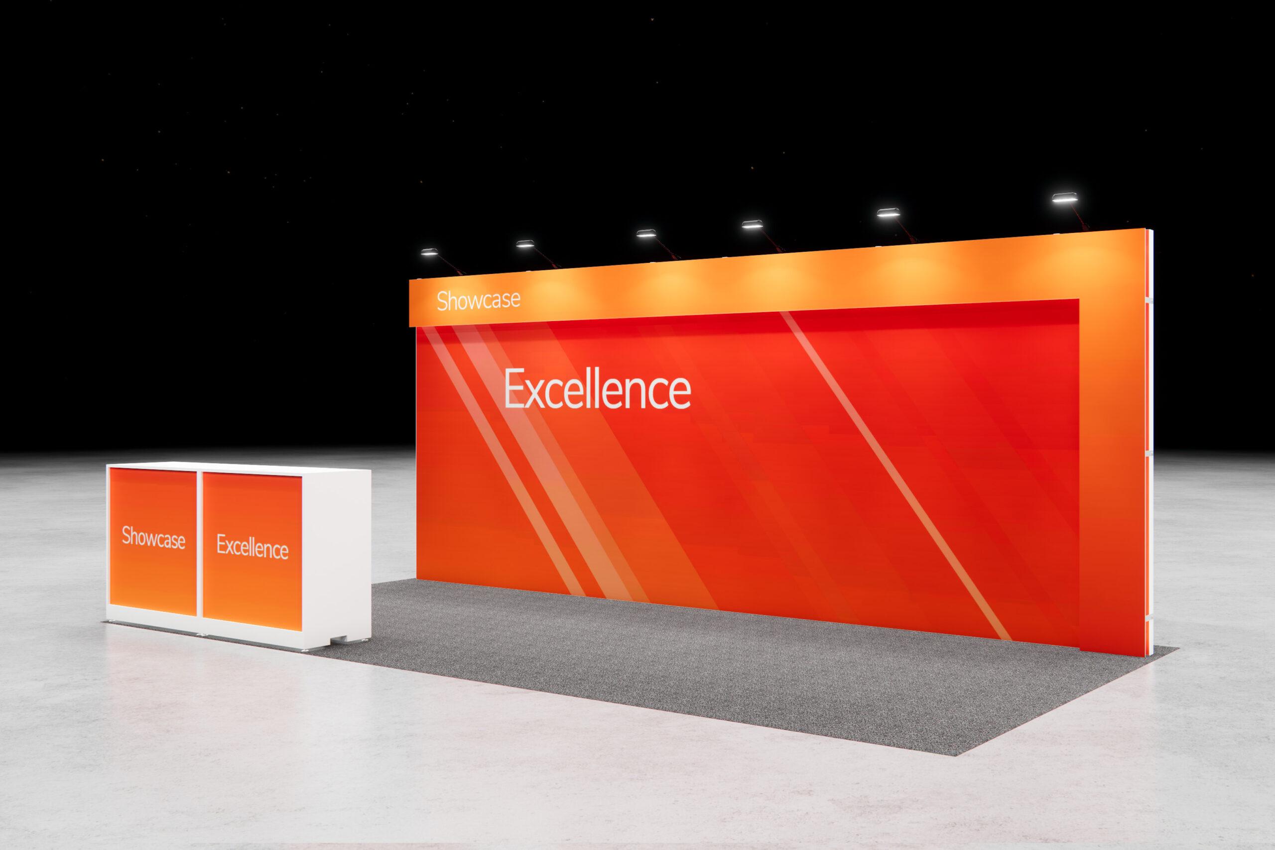 • This open-concept layout offers space for demos, meetings, or conversation—plus built-in storage to keep things tidy. Large graphic panels highlight your brand with bold visuals and messaging that draw visitors in.