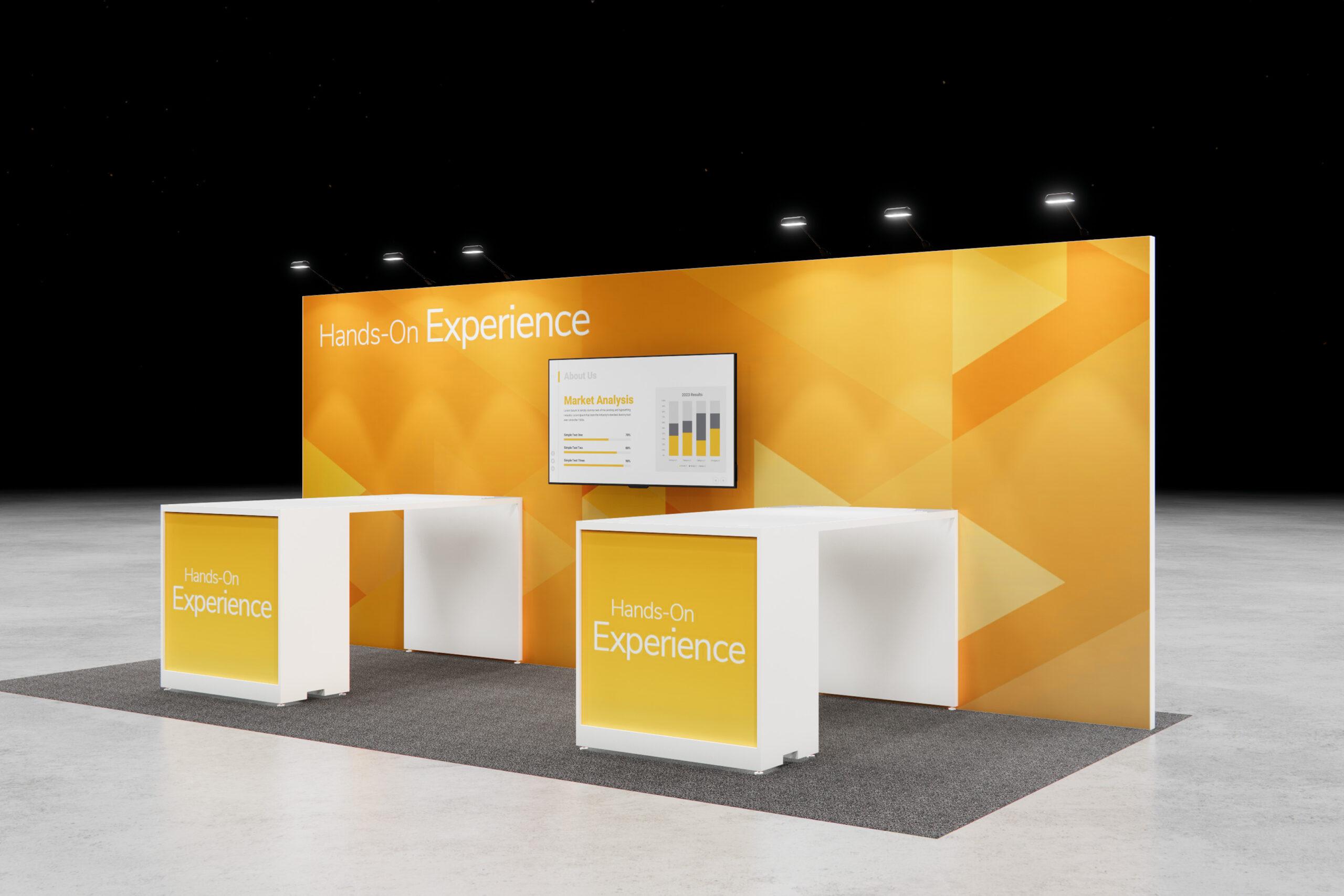• Engage attendees with a layout designed for face-to-face interaction. Two waterfall tables invite hands-on demos or discussions, while a digital display adds a dynamic way to showcase your content.