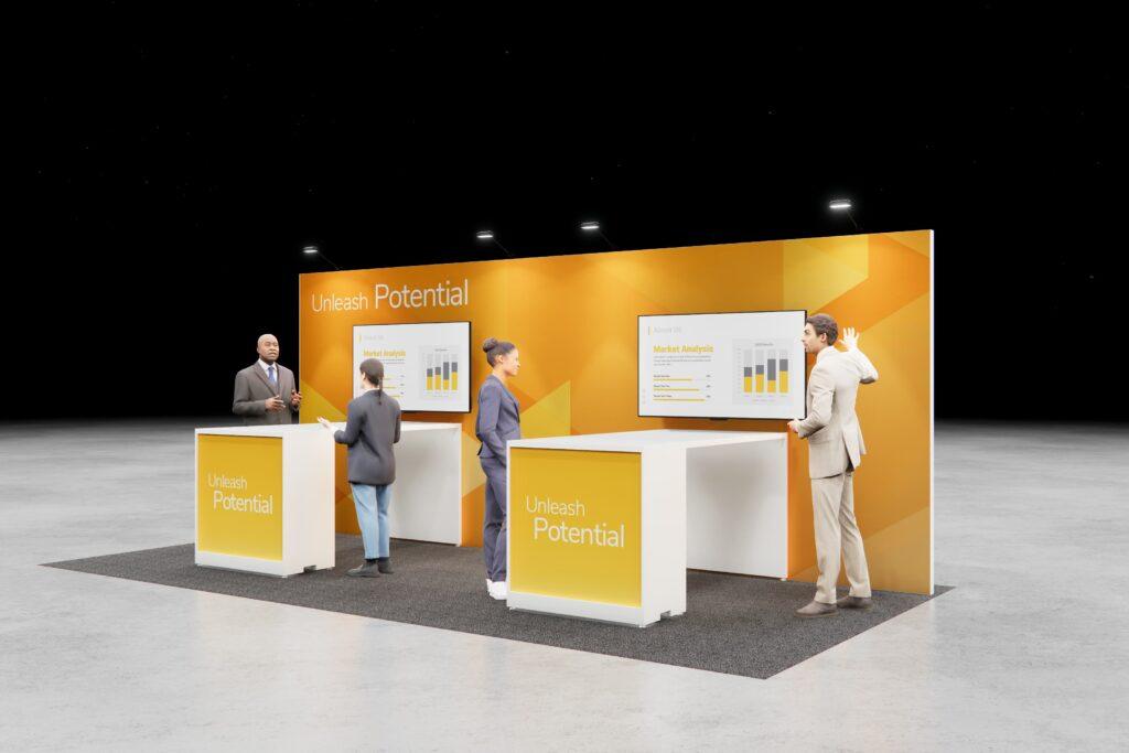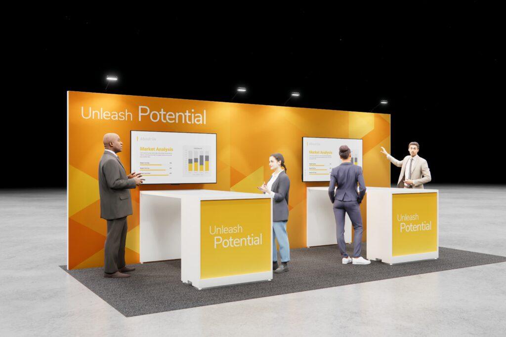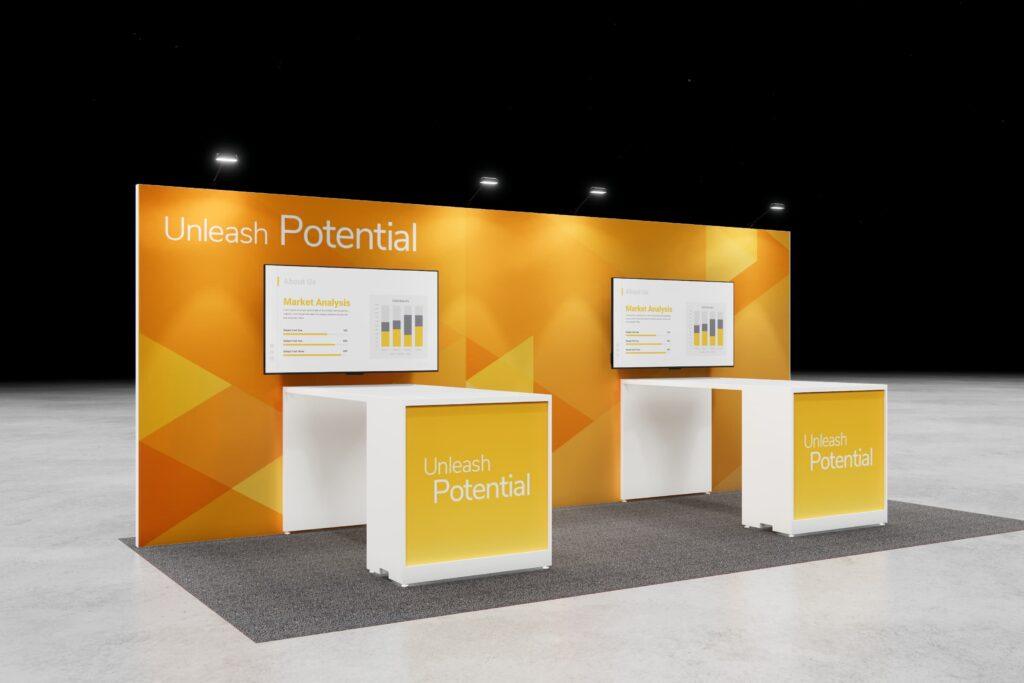 Engage attendees with a layout designed for face-to-face interaction. Two waterfall tables invite hands-on demos or discussions, while a digital display adds a dynamic way to showcase your content.